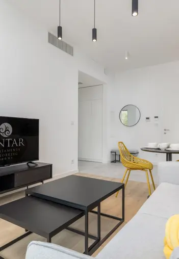Ekskluzywny, klimatyzowany apartament składający się z dwóch wygodnych pomieszczeń - pokoju dziennego, aneksu kuchennego oraz sypialni i łazienki. W pokoju znajduje się sofa z funkcją spania, tv oraz wydzielona część ze stołem jadalnym dla 4 osób. Na naszych Gości czeka w pełni wyposażona kuchnia oraz komfortowa łazienka. Apartament posiada zadaszony balkon oraz miejsce w parkingu podziemnym.